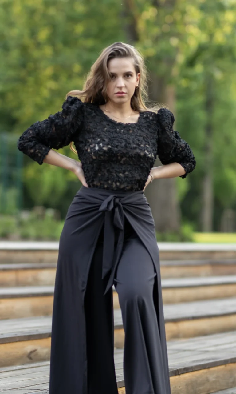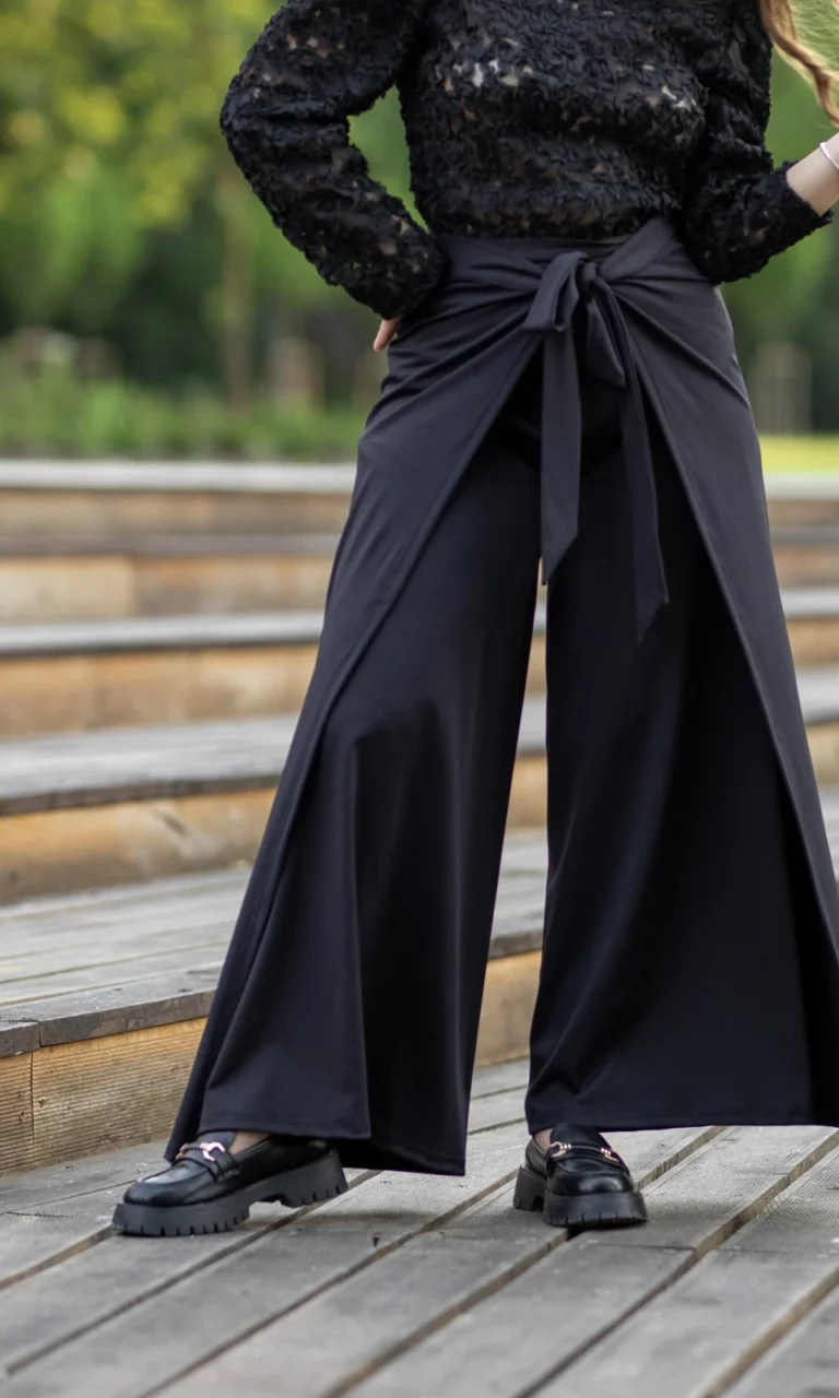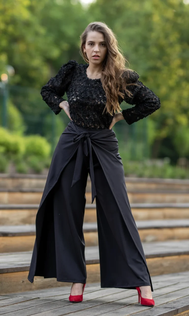 Charakterystyczny przekładany krój w okolicach kroku nadaje spodniom niebanalny, artystyczny wygląd, a wiązanie w pasie zakończone piękną kokardką podkreśla talię i dodaje całości kobiecego uroku.