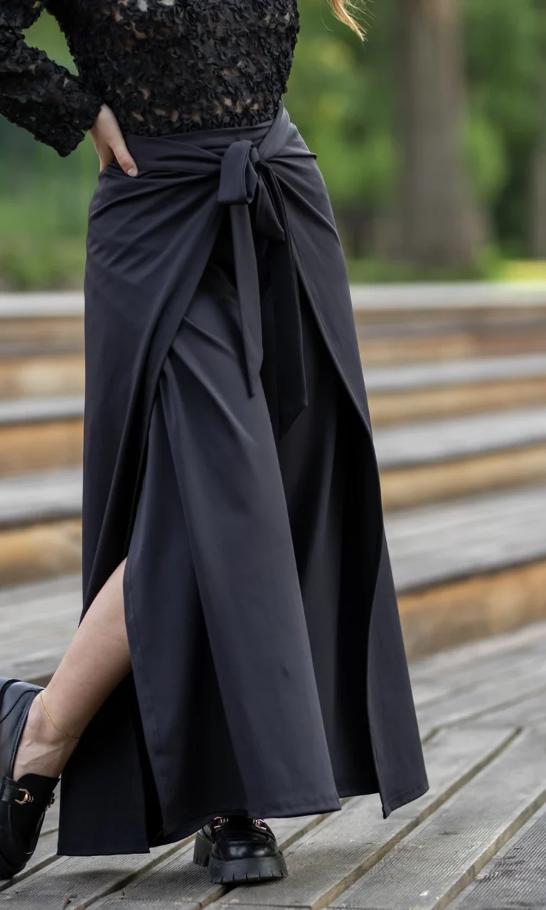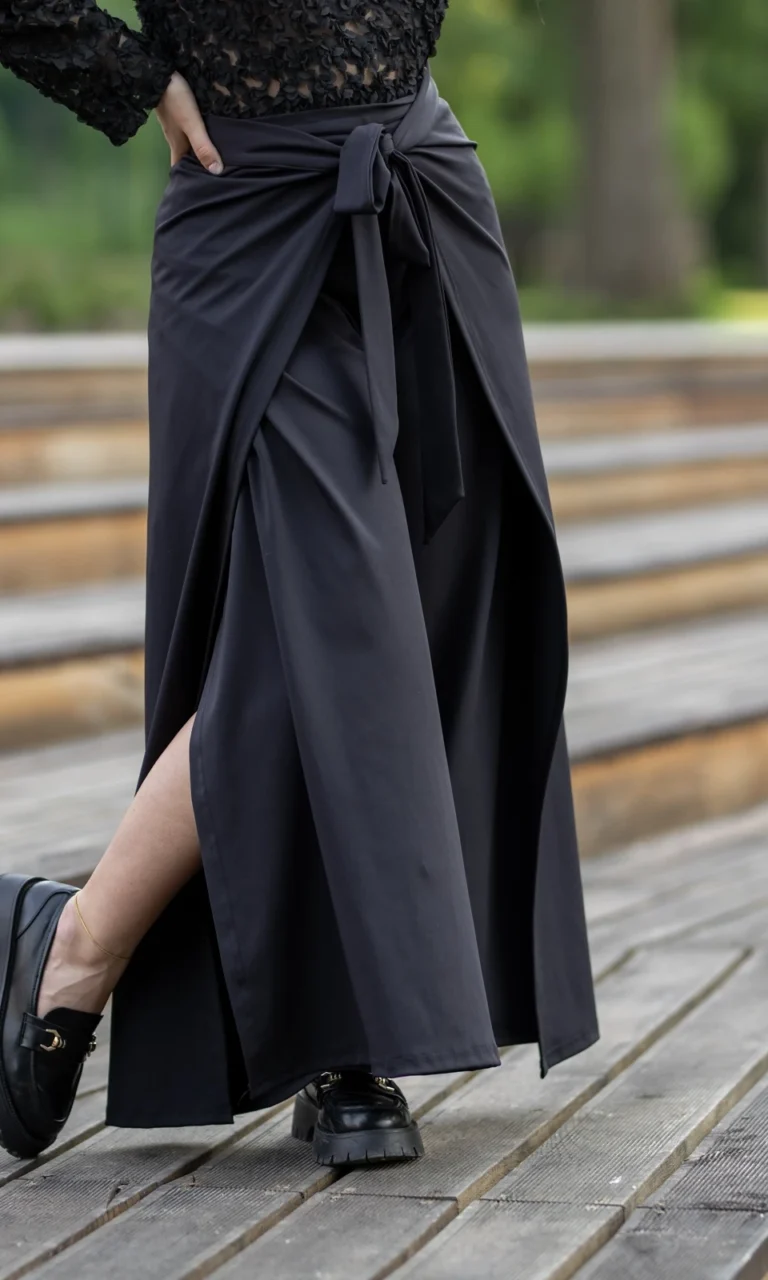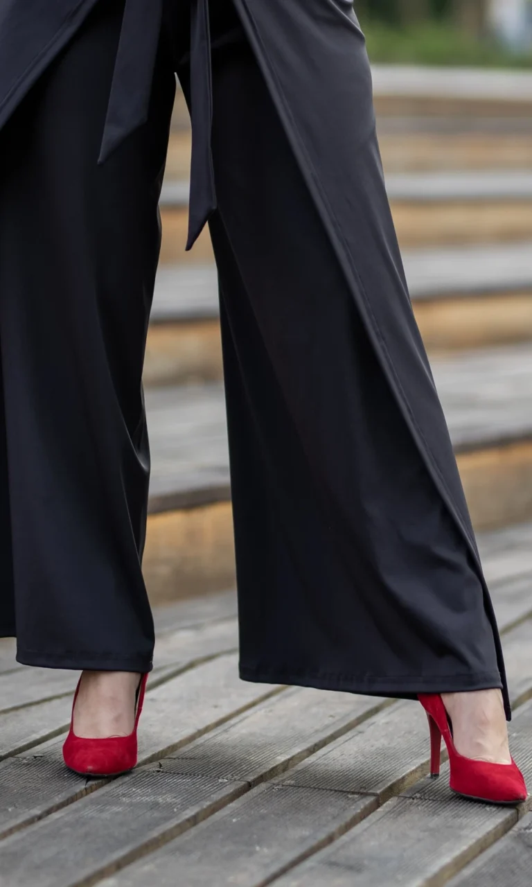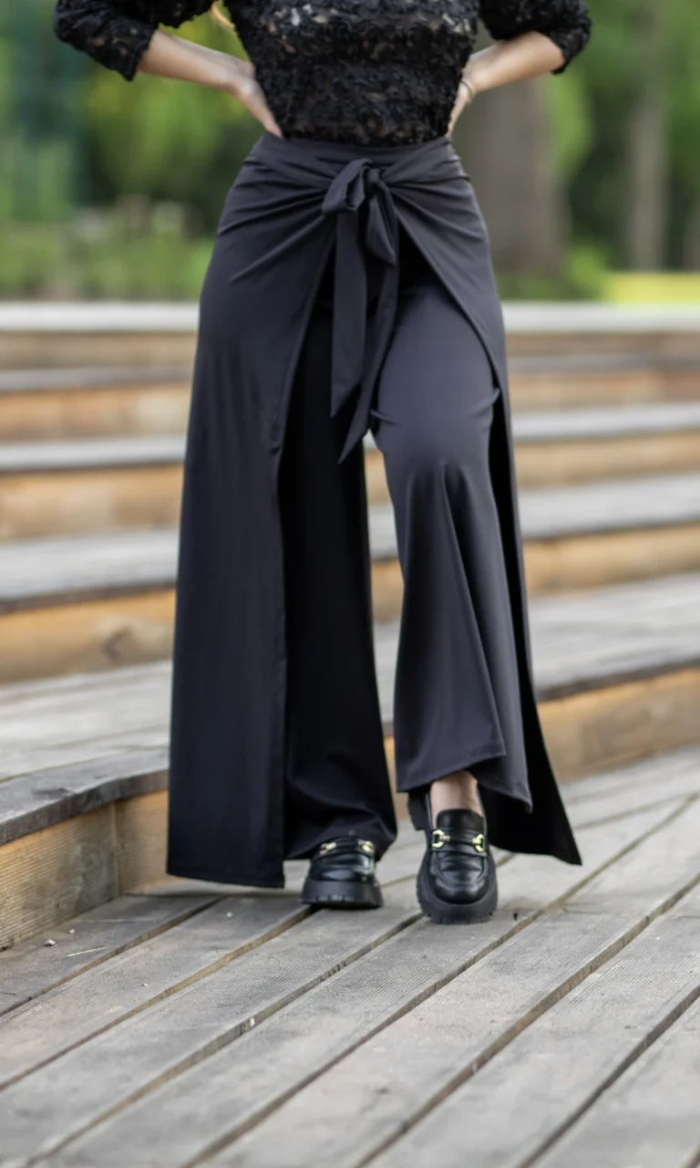 Charakterystyczny przekładany krój w okolicach kroku nadaje spodniom niebanalny, artystyczny wygląd, a wiązanie w pasie zakończone piękną kokardką podkreśla talię i dodaje całości kobiecego uroku.