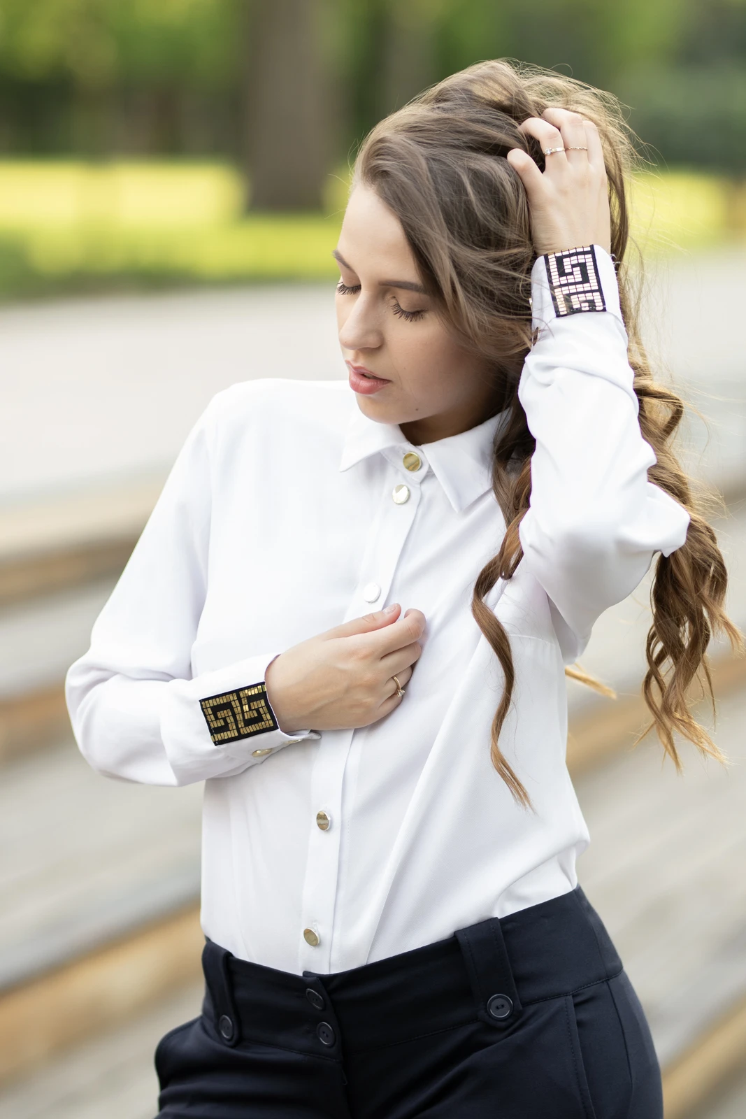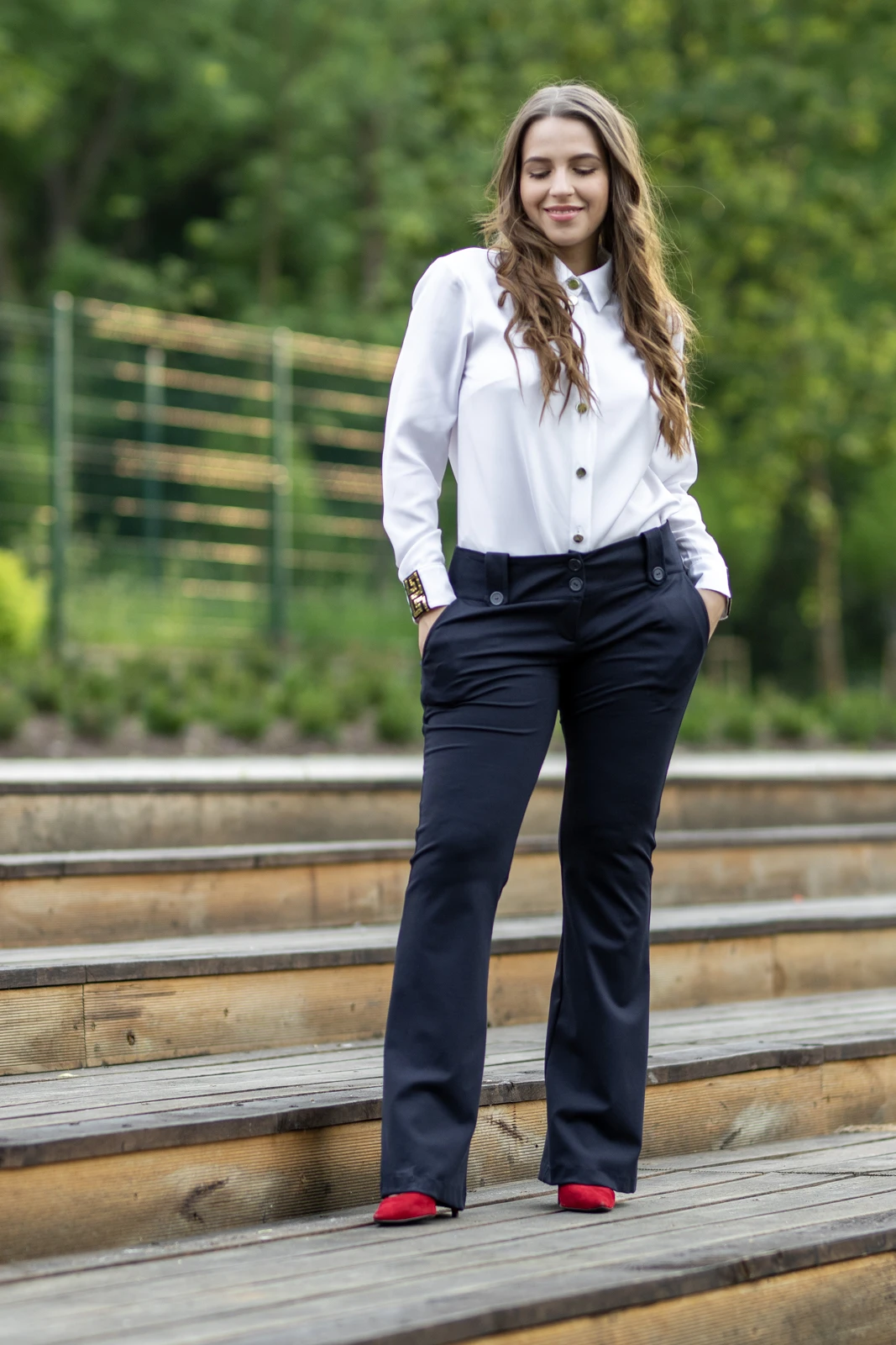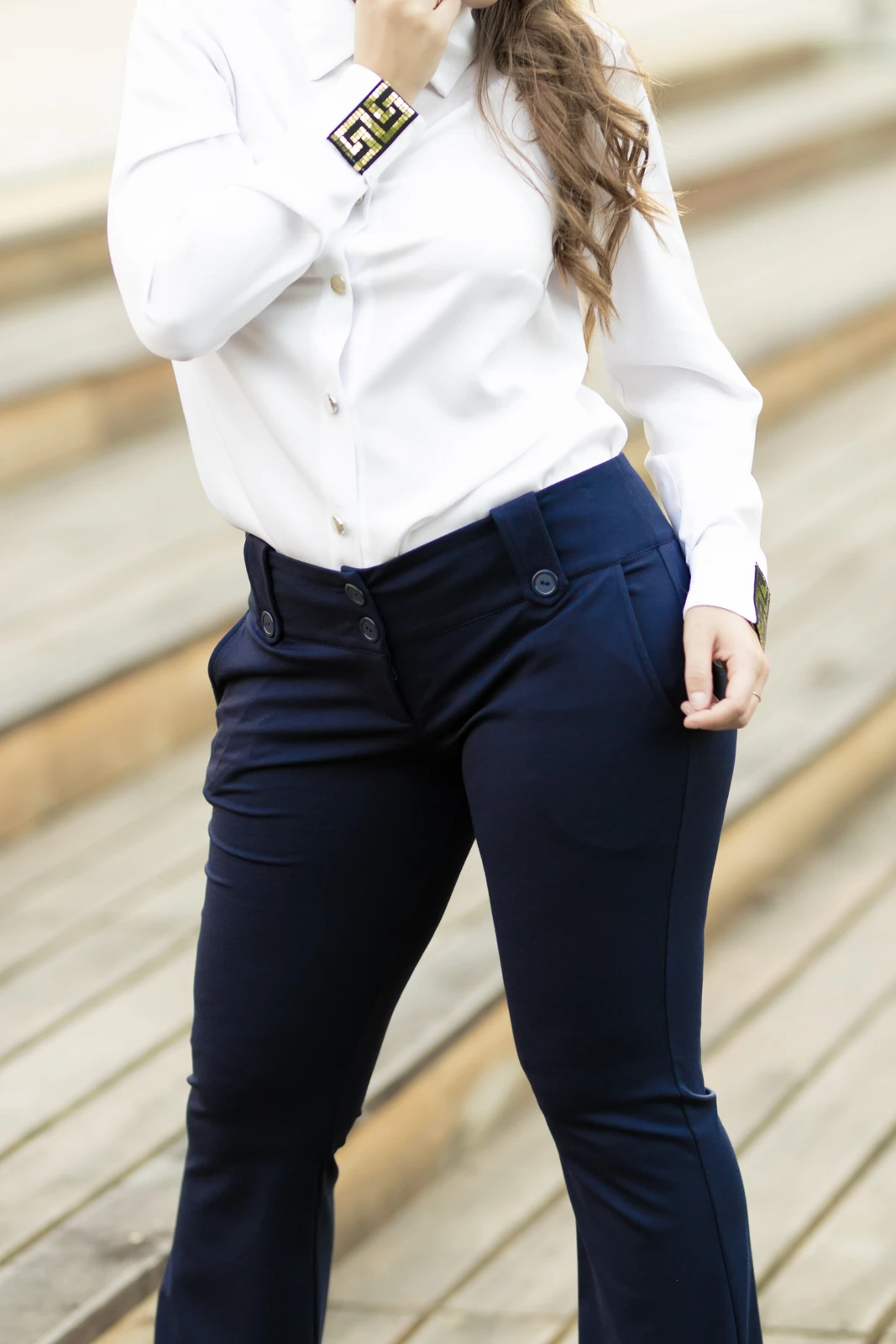 Fason z rozszerzanymi nogawkami optycznie wydłuża nogi i podkreśla kobiecą figurę, dodając stylizacji elegancji z nutą retro. W talii znajdują się guziki umieszczone na szlufkach, które przyciągają wzrok, nadając całości szykownego charakteru.