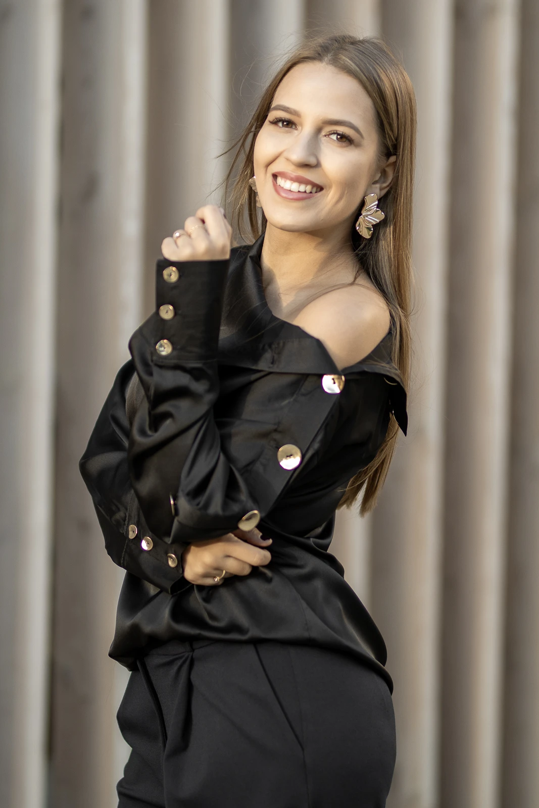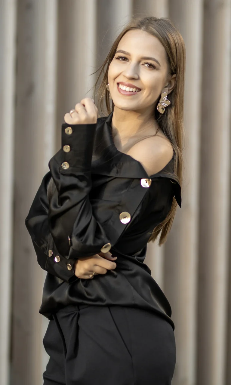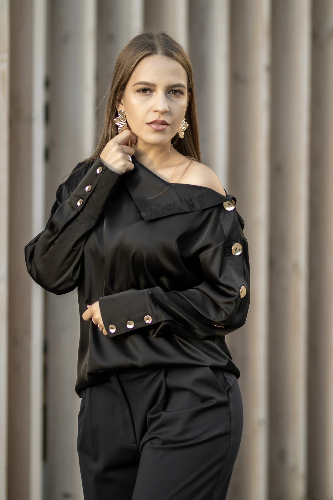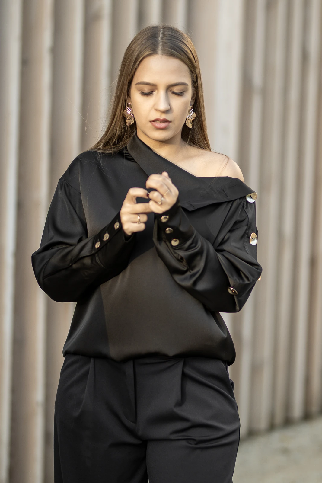 Stylowa i kobieca czarna bluzka z rozpinanym golfem, który można układać na różne sposoby – klasycznie lub odsłaniając jedno ramię, co dodaje stylizacji subtelnego wdzięku. Rękawy i ramiona zdobią efektowne złote guziki, które pięknie kontrastują z głęboką czernią materiału. Bluzka wykonana jest z przyjemnej tkaniny o delikatnym połysku, dzięki czemu prezentuje się wyjątkowo elegancko.